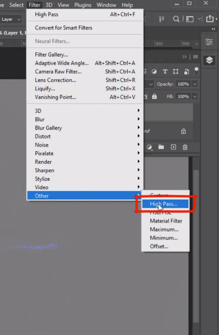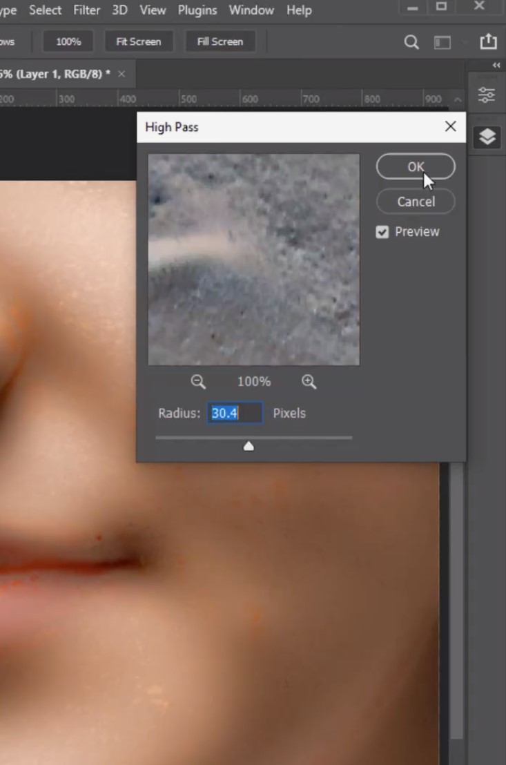 3. [Filter]-[Other]-[High Pass] / [필터]-[기타]-[하이 패스]를 선택하여 피부가 아래 이미지 정도로 뿌해지는 값으로 설정 후 OK를 누릅니다.