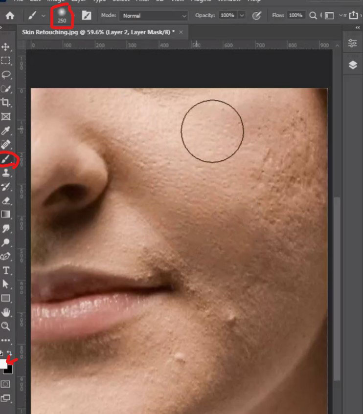 6. 부드러운 브러시를 선택한 후 "흰색"으로 안좋은 피부면을 칠합니다.